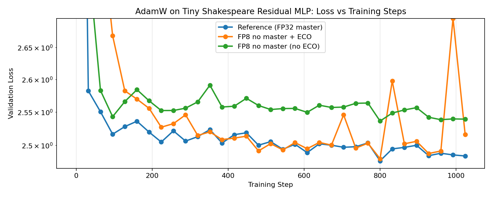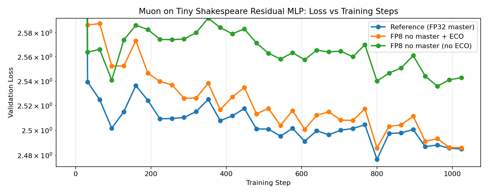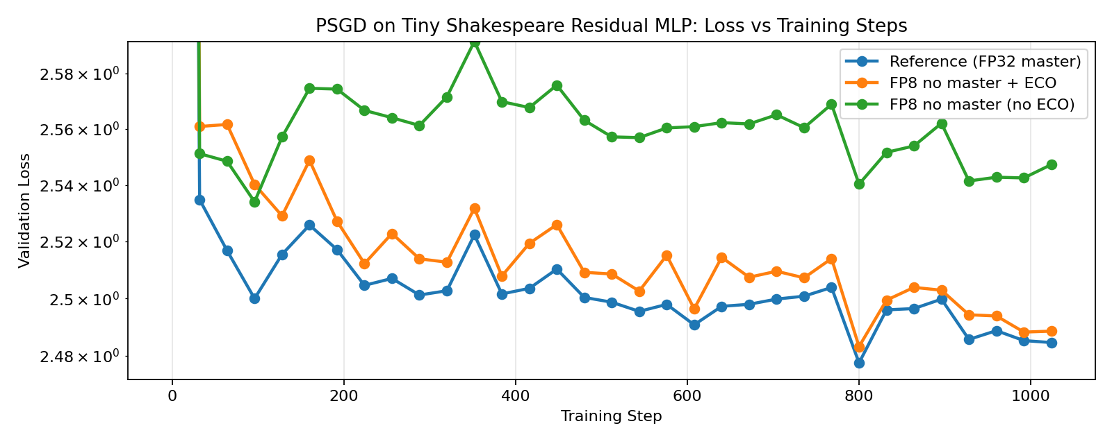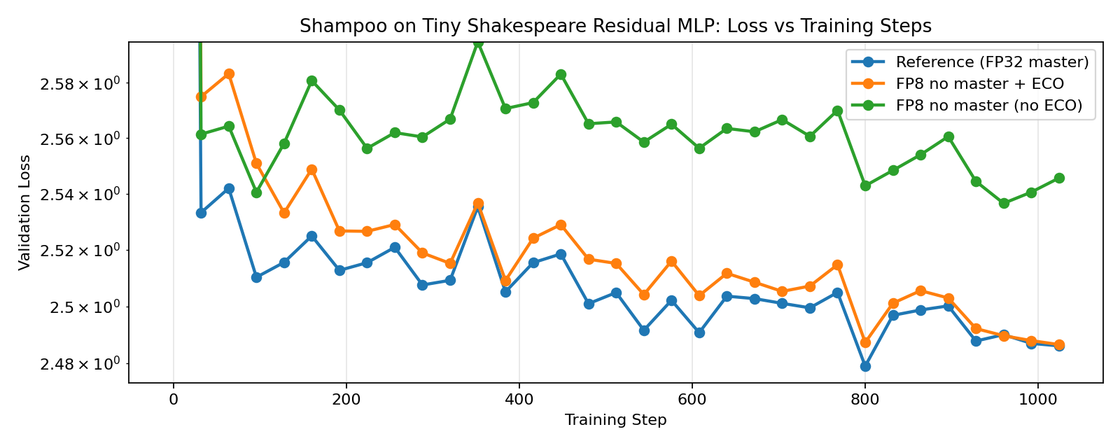 Here we train 4-layer Residual MLPs on the Tiny Shakespeare dataset with FP8 ECO-AdamW, ECO-Muon, ECO-Shampoo, and ECO-PSGD, and compare with their (still FP8) non-ECO counterparts and reference full-precision implementions. For the FP8 training runs, we quantize both the weights and activations with a straight-through estimator in the forward pass of the linear layers. Language model heads are kept in full-precision for all runs since it is the most sensitive to quantization. And Embedding layers are always optimized either by ECO-AdamW or its non-ECO counterpart since Muon/Shampoo/PSGD are only designed for linear layers. And lastly, we also match the spectral norms of the updates for Muon, Shampoo, and PSGD to that of AdamW for a more direct comparison.
