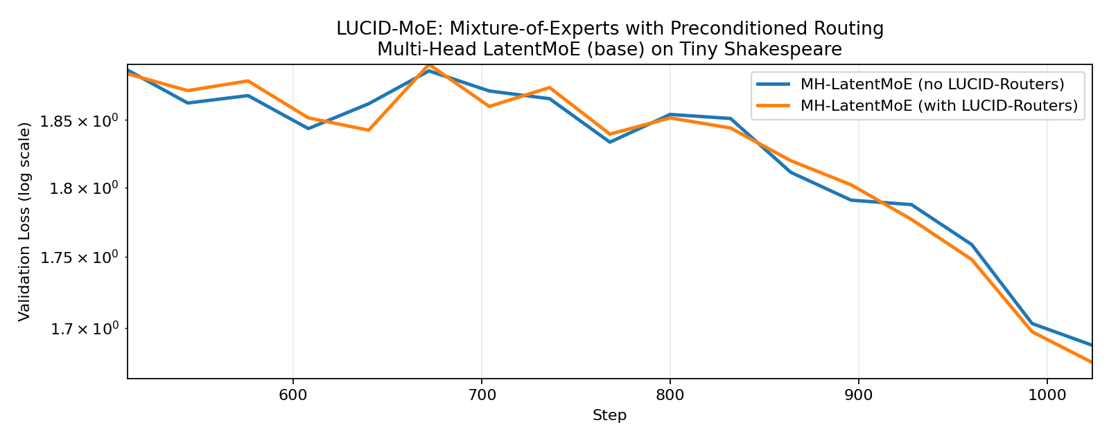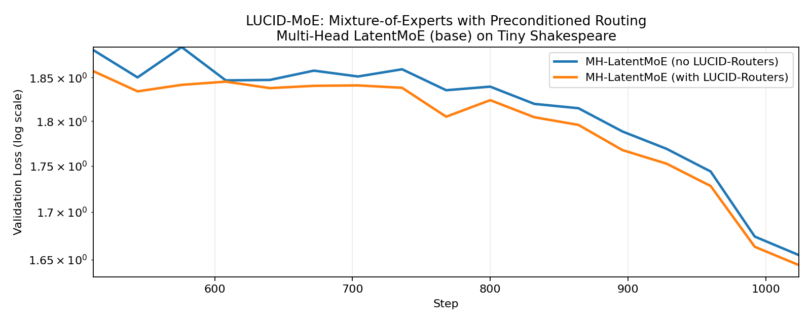 Here we train a 2-layer Latent-MoE model (Cui et al., 2026) on TinyShakespeare, with 64 experts, top-8 routing, auxiliary-free expert load balancing, and the Muon optimizer (Jordan et al., 2024). We observe that both LUCID-Softmax-MoE and LUCID-Sigmoid-MoE achieve better validation loss and lower max expert load violation compared to their standard counterparts, with the sigmoid gating variant having a more significant improvement.