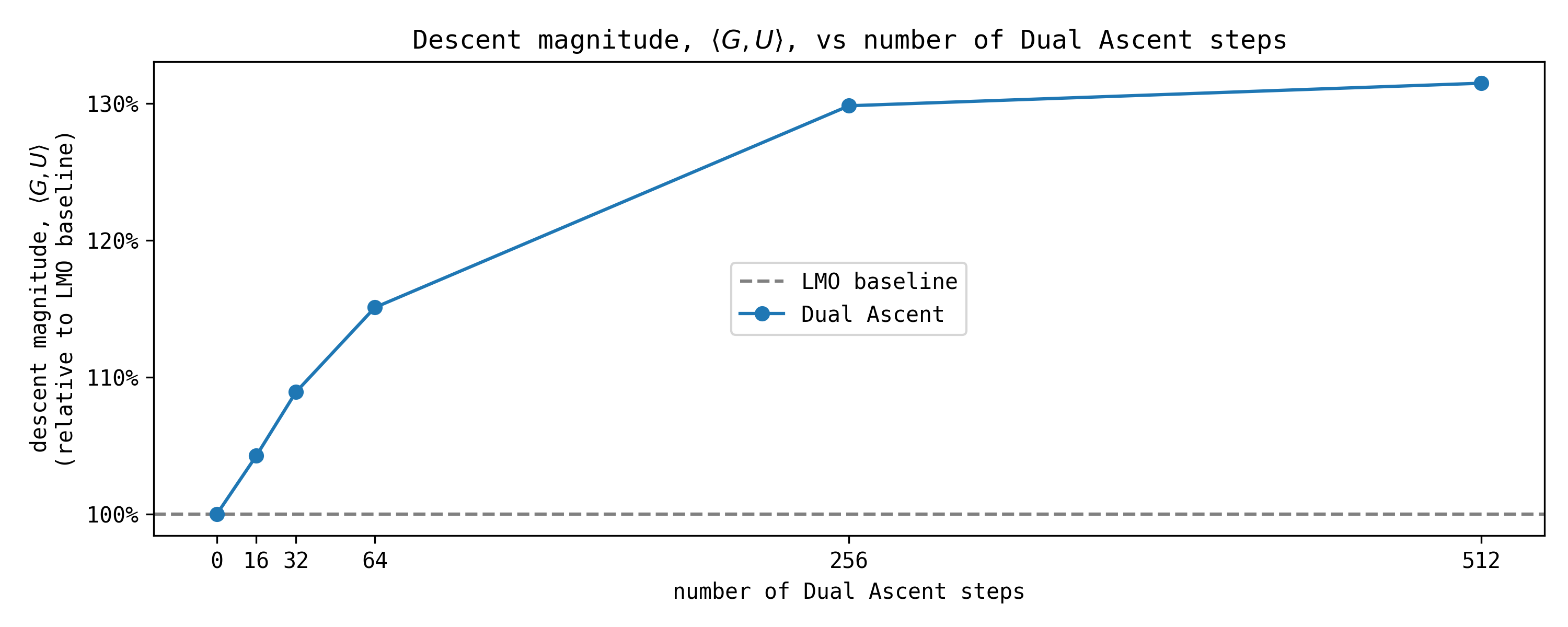 $$\begin{equation} \text{descent\_magnitude} = \langle G_t, \texttt{retract}_{\mathcal{B}_n}(W_t + A_t^*) - W_t \rangle \end{equation}$$of our dual ascent optimizer after varying number of dual ascent steps relative to the LMO baseline (i.e., using only the LMO without considering the tangent cone constraints). We see that our optimizer yields larger effective weight updates across dual ascent steps.