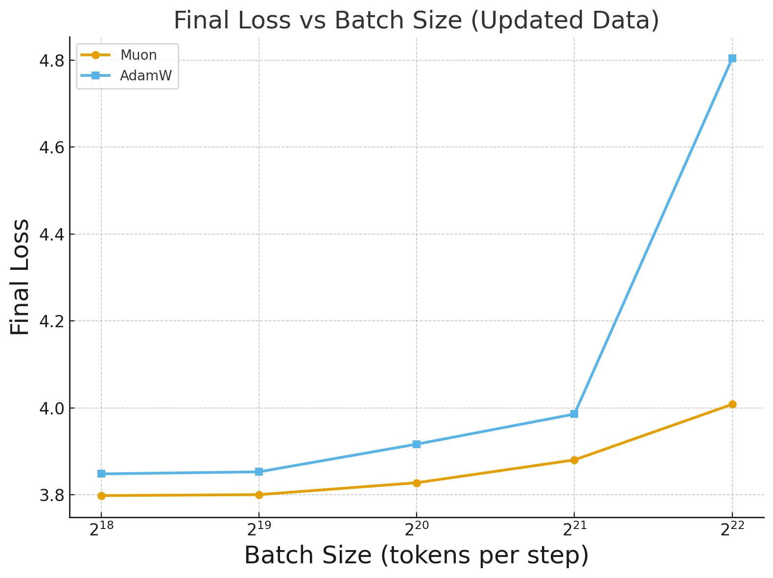 Here we train a 130M parameter Llama-based Transformer model using both AdamW and Muon optimizers for 1 Chinchilla. We sweep over batch sizes from $2^{18}$ to $2^{22}$ tokens, and for each batch size, we scale the learning rate $\eta$ as $\eta = \eta_0 \sqrt{b / b_0}$ (Equation $\eqref{eq:lr-bz-scaling}$), where $b_0 \approx 2^{19}$ and $\eta_0$ is the optimal learning rate found for $b_0$ for each optimizer (Wen et al., 2025). We then plot the validation loss against the batch size in the figure above.