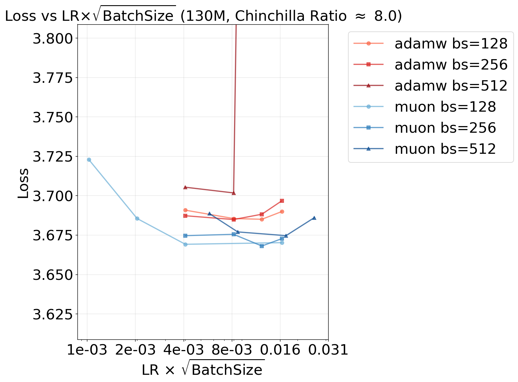 Here we show that the square root learning rate scaling rule as in Equation $\eqref{eq:lr-bz-scaling}$ is effective for both AdamW and Muon optimizers. We train a 130M parameter Llama-based Transformer model using both optimizers for 8 Chinchilla, sweeping over learning rates and batch sizes. We then plot the validation loss against the learning rate & batch size in the figure above. Notice that the optimal $(\eta, \sqrt{b})$ pair remains roughly constant for both optimizers, confirming the effectiveness of the square root learning rate scaling rule.