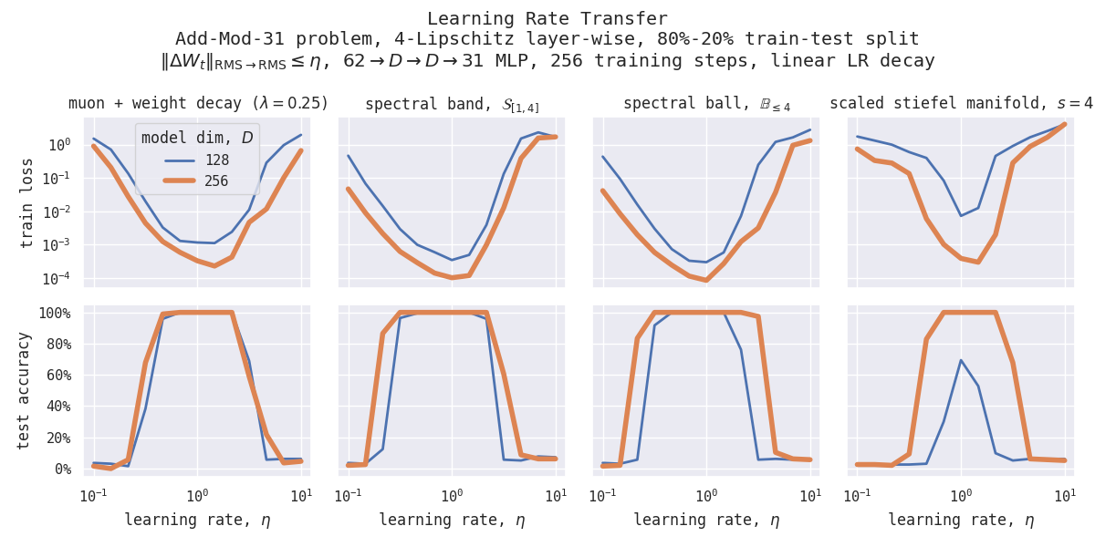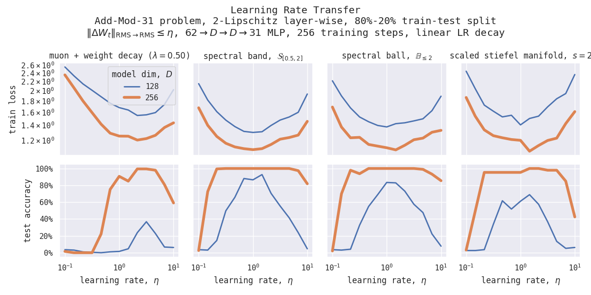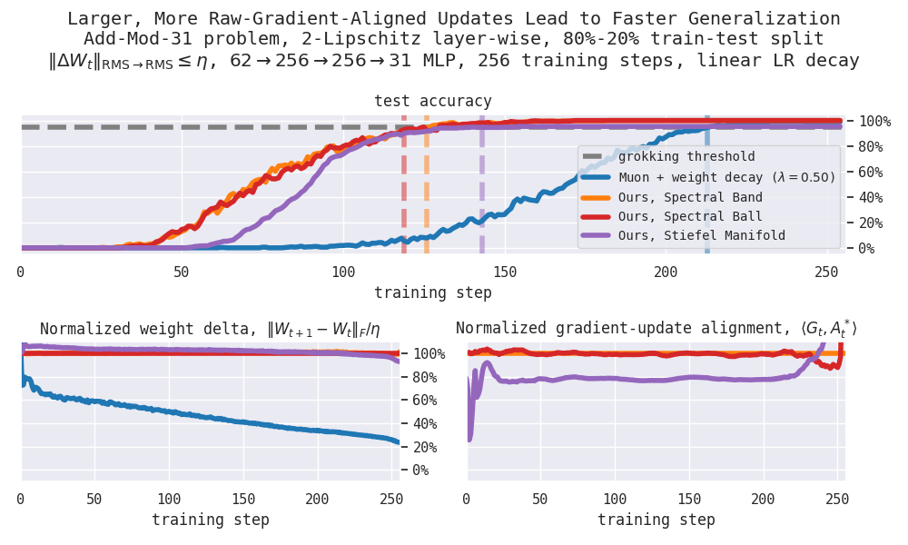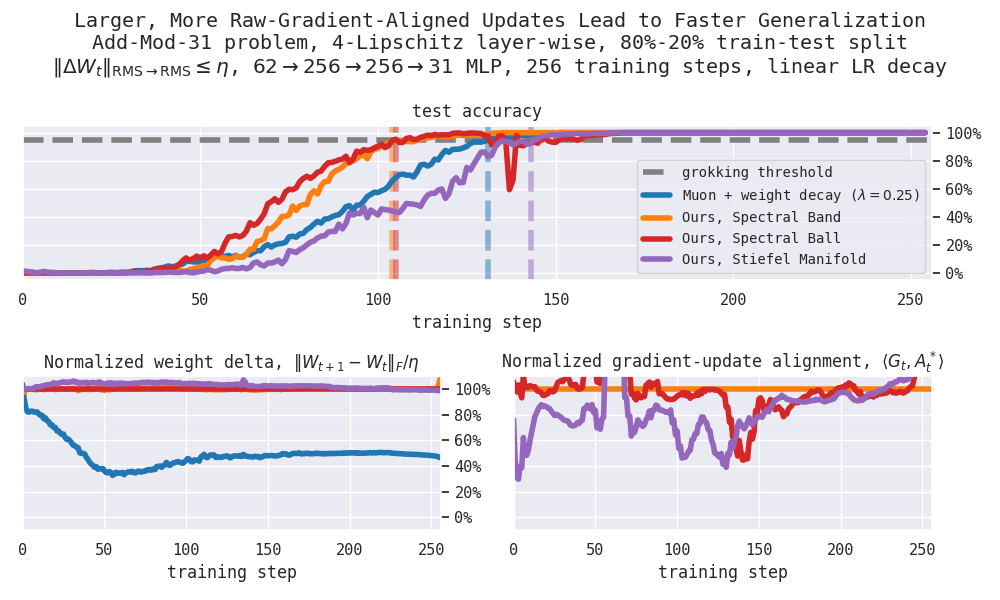 Here we compare how our novel optimizers affect grokking speed on the Addition-Modulo-$31$ problem. In the Figure above, notice that steepest descent on the Stiefel manifold hurts grokking performance on the $4$-Lipschitz layer-wise setting, likely because it restricts the model too much. On the other hand, steepest descent on the Spectral Ball and Spectral Band lead to faster grokking compared to baseline on both $2$-Lipschitz and $4$-Lipschitz settings. We believe this is because (1) the retraction maps for these geometries do not ‘interfere’ with the updates as much as weight decay does, leading to larger weight deltas overall (also refer to the Figure in Section 2.1), and (2) the constraints imposed by these geometries on the updates are lighter compared to the Stiefel manifold, allowing the updates to be more aligned with the ‘raw’ gradients.