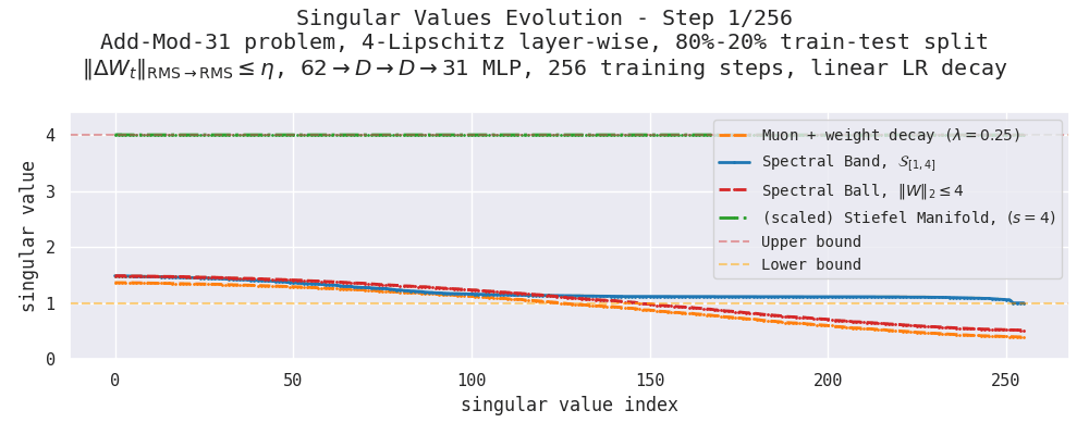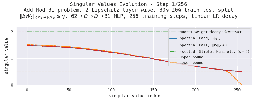 In the Figures above, we plot the evolution of the singular values of the weights during training with our Muon + decoupled weight decay baseline and our new optimizers. We also highlight the line corresponding to the optimizer whenever the model groks the problem (that is, once it reaches $\geq 95\%$ test accuracy). As we can see, Muon with decoupled weight decay indeed keeps the singular values bounded above by $\frac{1}{\lambda}$ throughout training, and our Steepest Descent optimizers keeps the singular values within the bounds imposed by their respective geometries.